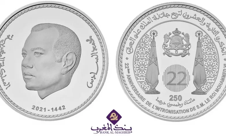 أصدر بنك المغرب قطعة نقدية تذكارية فضية من فئة 250 درهما، احتفاءا بالذكرى الثانية والعشرين لتربع الملك محمد السادس على عرش