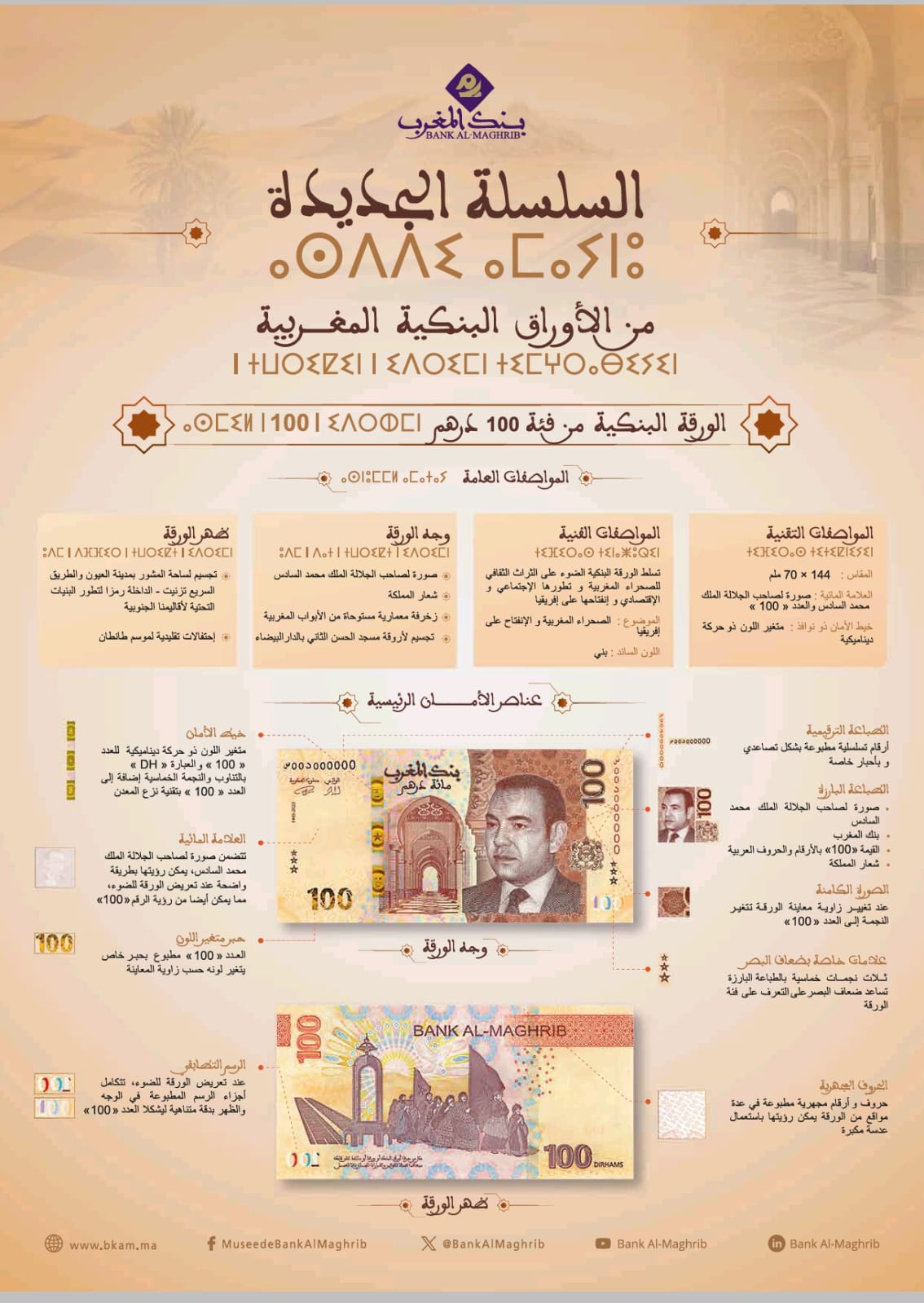 وتبــرز الورقــة البنكيــة مــن فئــة 100 درهــم التــراث الثقافــي للصحــراء المغربيــة وتطورهــا الاجتماعــي والاقتصــادي وانفتاحهــا علــى إفريقيــا.