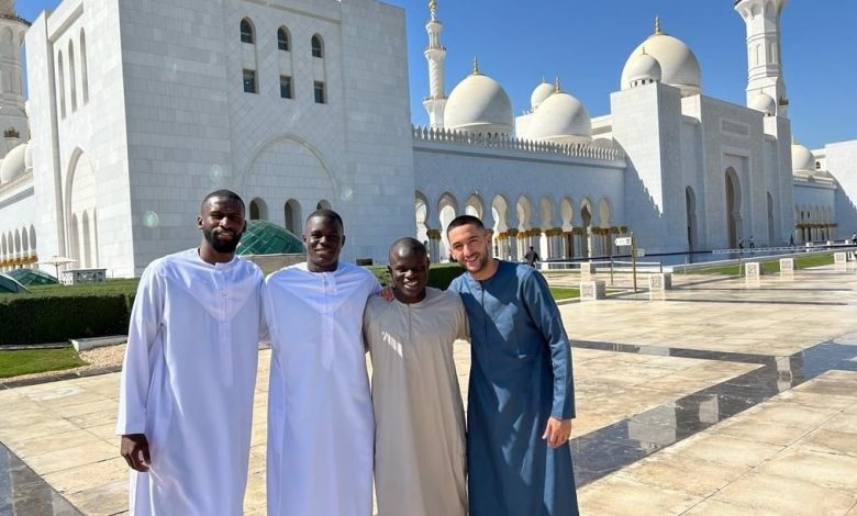 وظهر المغربي حكيم زياش، في صورة من أمام المسجد، نشرها الألماني أنطونيو روديغر، عبر حسابه بموقع التواصل الإجتماعي “تويتر”، تجمعه مع كل زياش و والفرنسيين نغولو كانتي ومالانغ سار.