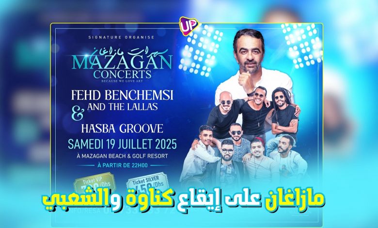 ويَضرب المنظمون لجمهور الفن موعدًا موسيقيًا مميزًا يوم السبت 19 يوليوز 2025 داخل فضاءات منتجع مازاغان، مع حفل حيّ يحييه الفنان فهد بنشمسي رفقة فرقة The Lallas، إلى جانب المجموعة الموسيقية Hasba Groove، وذلك لأول مرة بمدينة الجديدة.