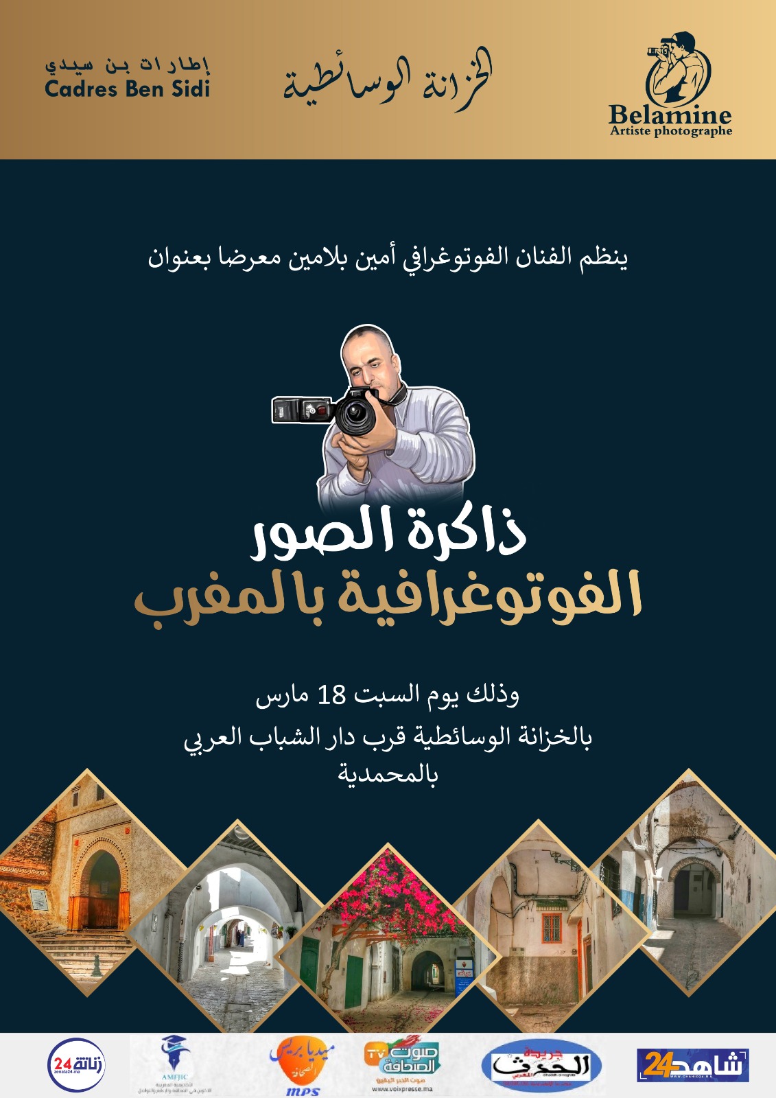 تحتضن الخزانة الوسائطية بالمحمدية يوم السبت 18 مارس معرض للفنان الفوتوغرافي أمين خالد بلامين بعنوان ذاكرة الصور الفوتوغرافية وفي تقديم للمعرض الفوتوغرافي قال خالد امين ان الفنان الفوتوغرافي لم يعد ذلك المصور الذي يلتقط المشهد بكل عشوائي وإنما أصبح الفنان يستجيب الحساسه وبهذا فهو يستجيب للذات الشعرية تسكنه.